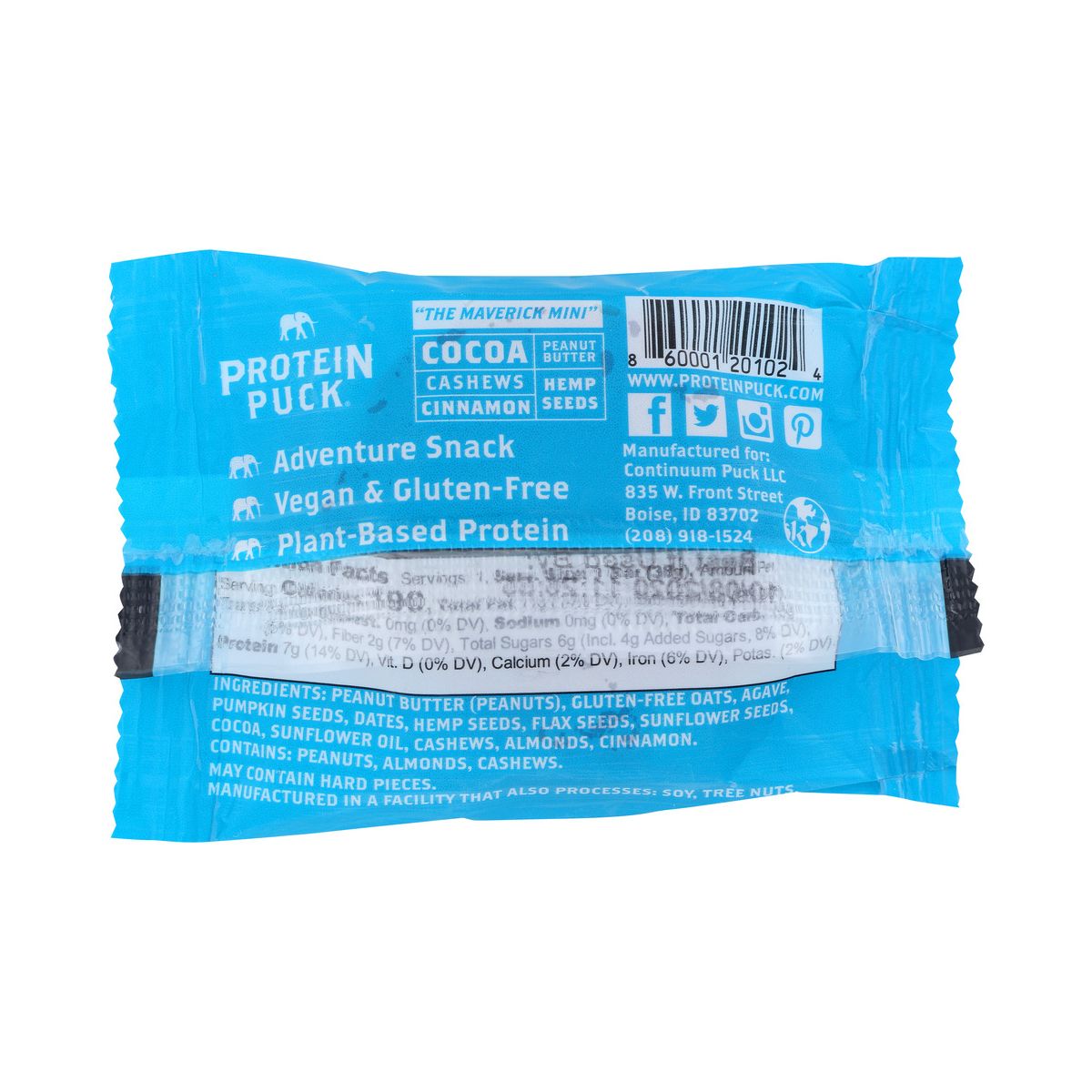 Barra de proteína vegana Protein Puck con cacao, anacardos y canela. Deliciosa textura masticable. ¡Pruébala!