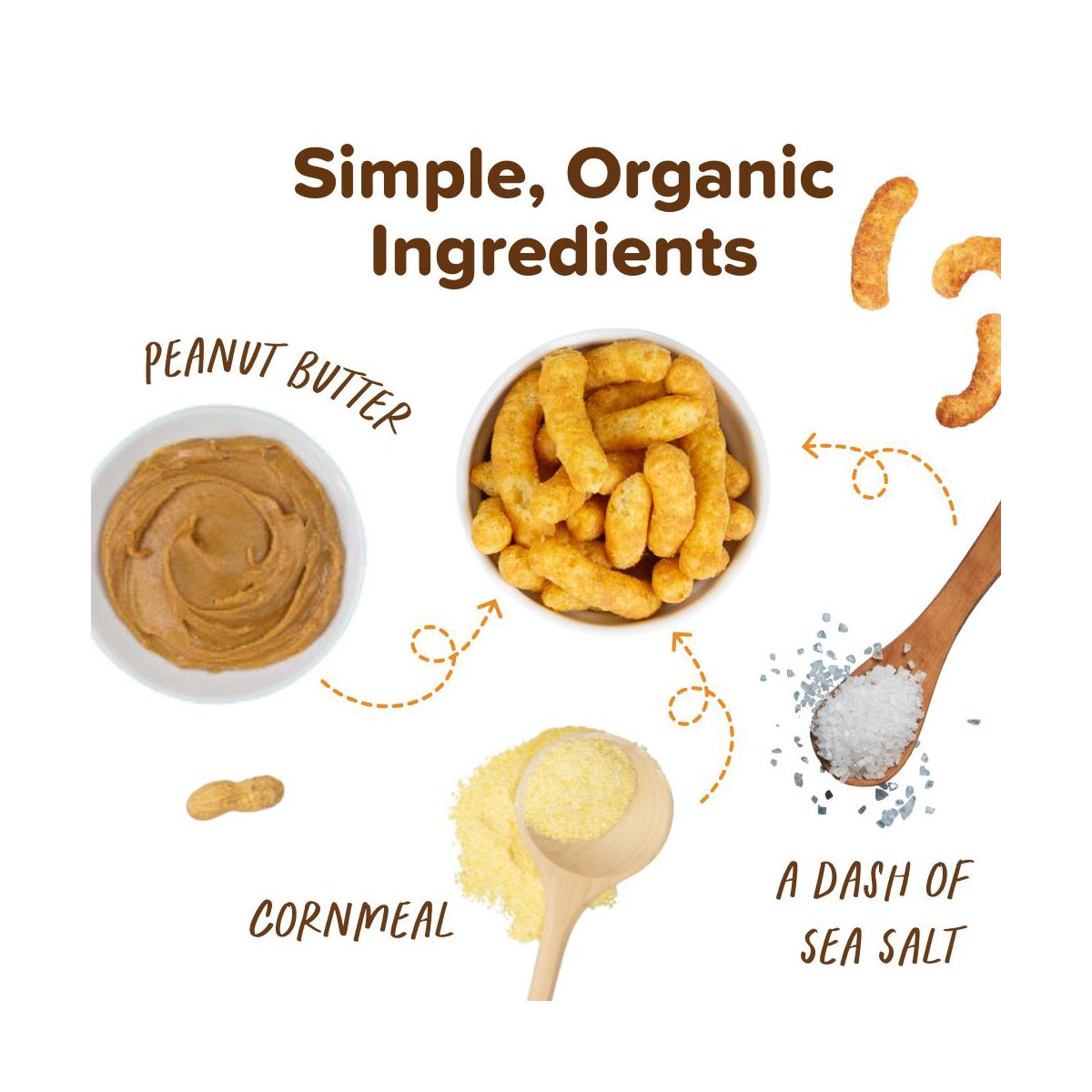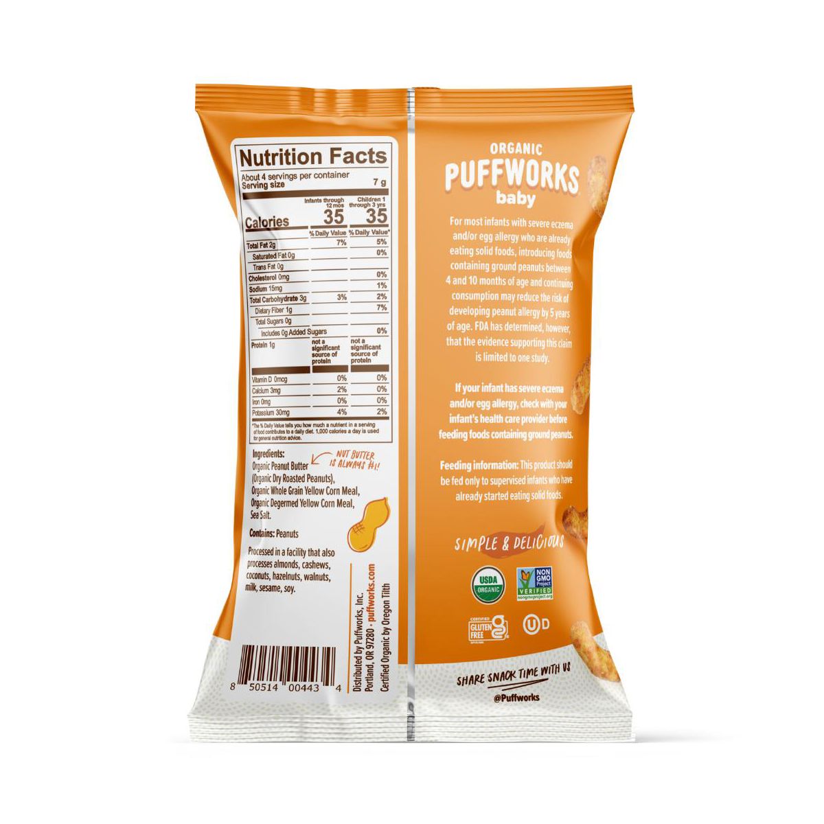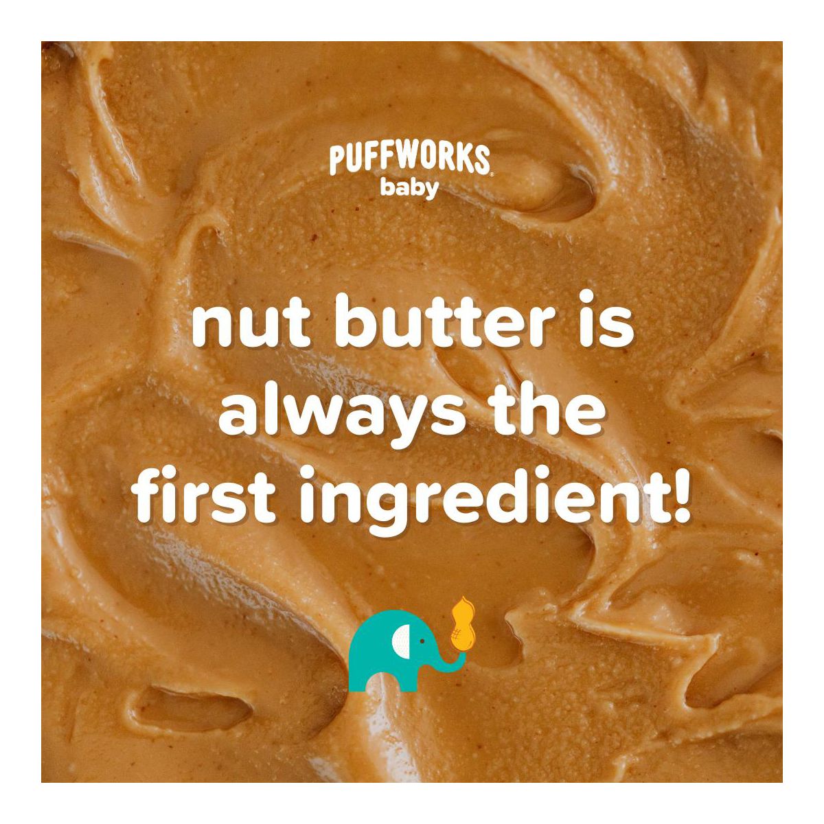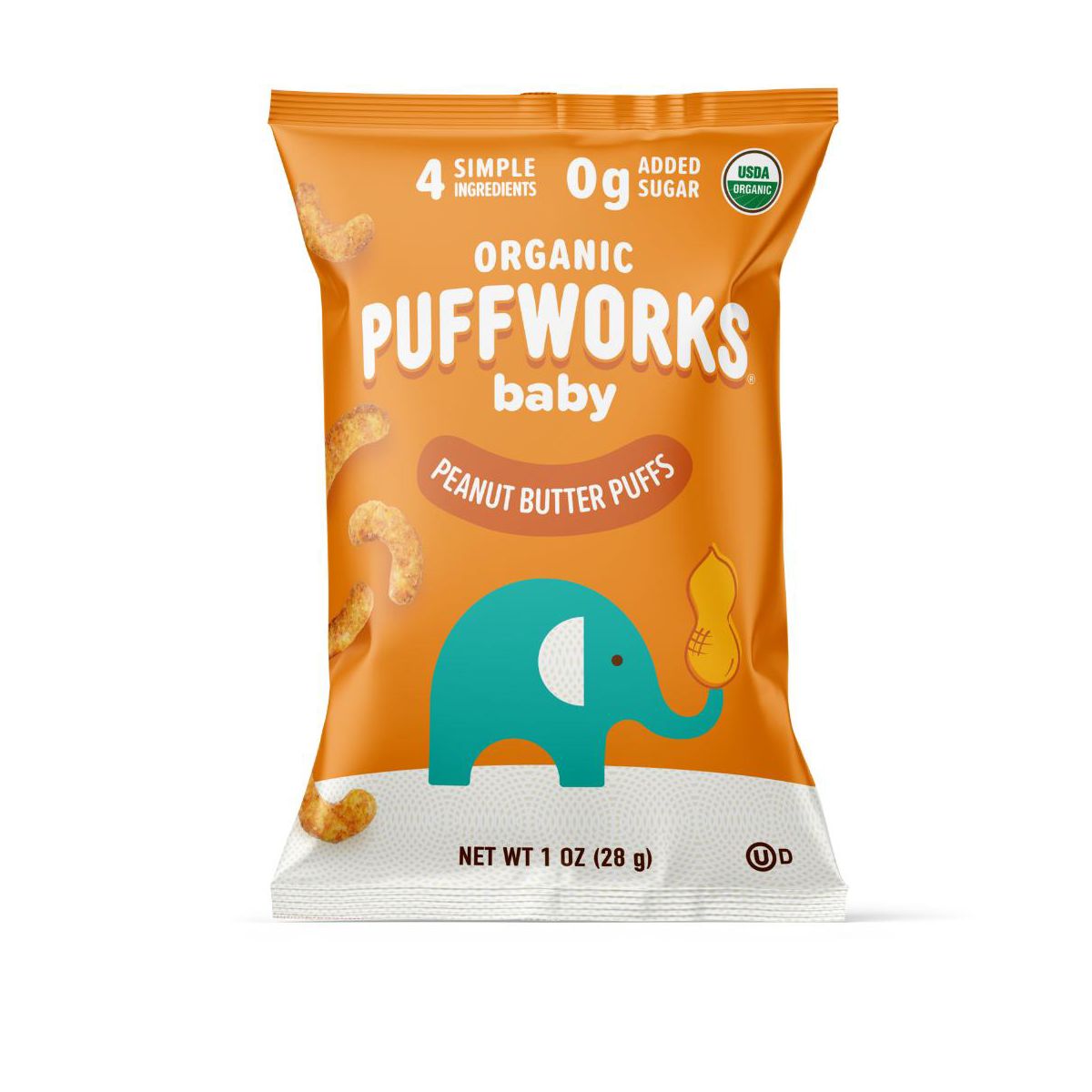 Disfruta las Puffworks Baby Puffs Orgánicas de Mantequilla de Cacahuate. Un snack ligero y nutritivo, perfecto para tu bebé. ¡Delicioso y saludable!