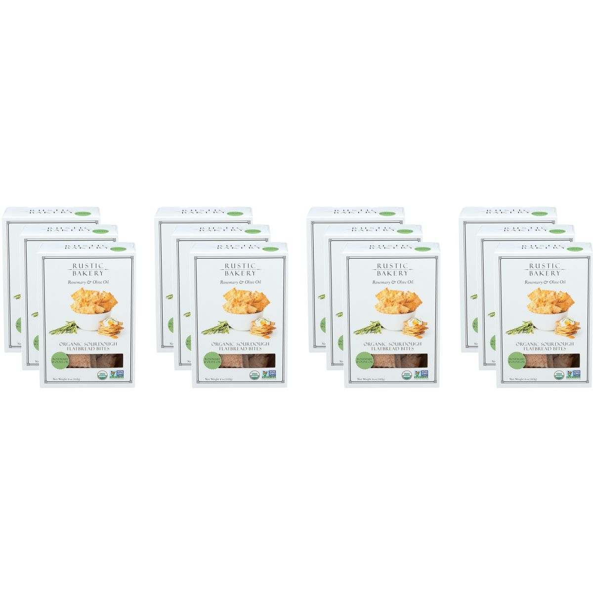 Disfruta los Flatbread Bites de Rustic Bakery con aceite de oliva y romero. Snack crujiente en caja de 12. ¡Sabor artesanal en cada pieza!