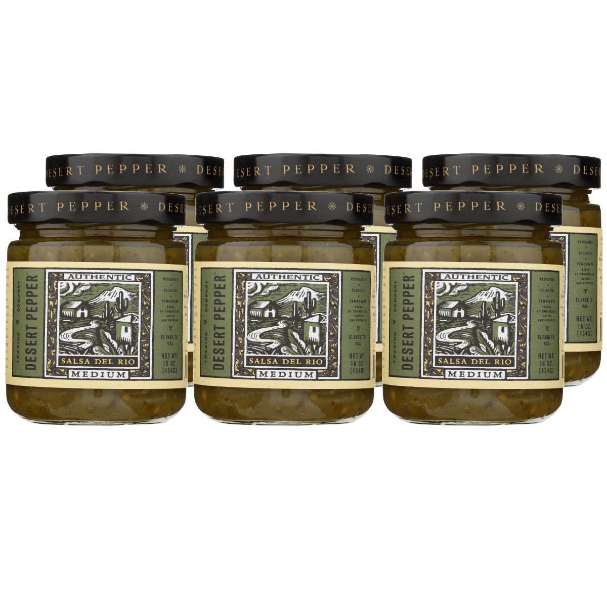 Salsa Del Rio Medium de Desert Pepper. Caja con 6 botellas de 16 oz. Sabor auténtico y balanceado, libre de los 9 alérgenos principales. ¡Pruébala!