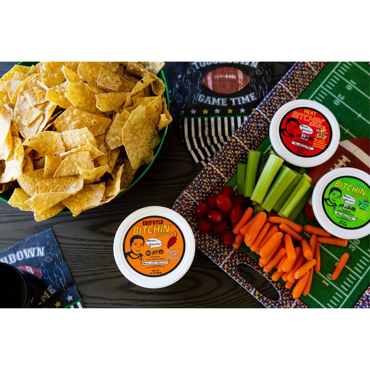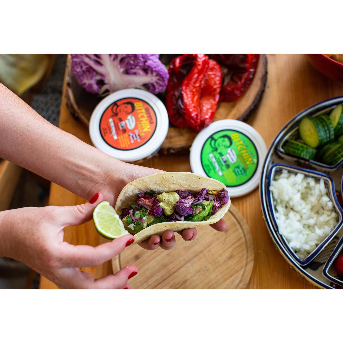 Salsa Bitchin’ Sauce Cilantro Chili. Deliciosa salsa cremosa a base de almendras, lista para disfrutar con tus botanas favoritas. ¡Sabor único!