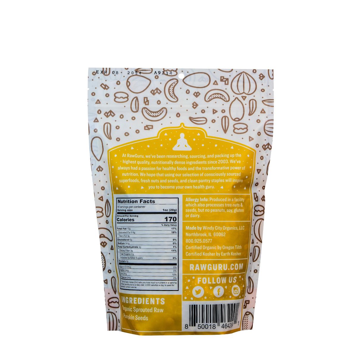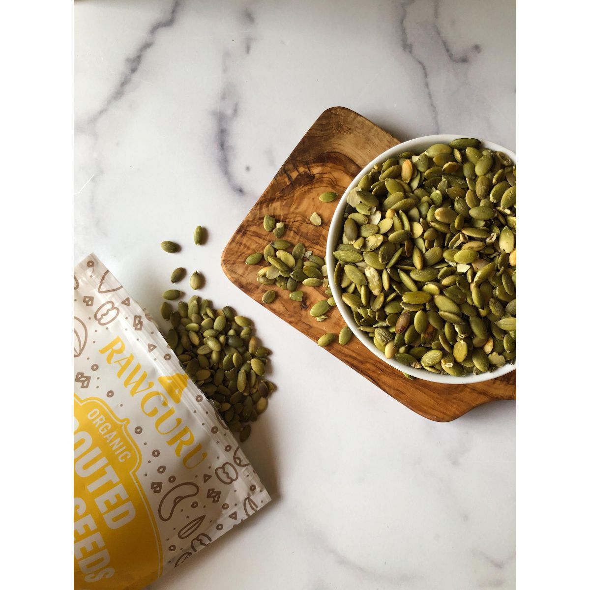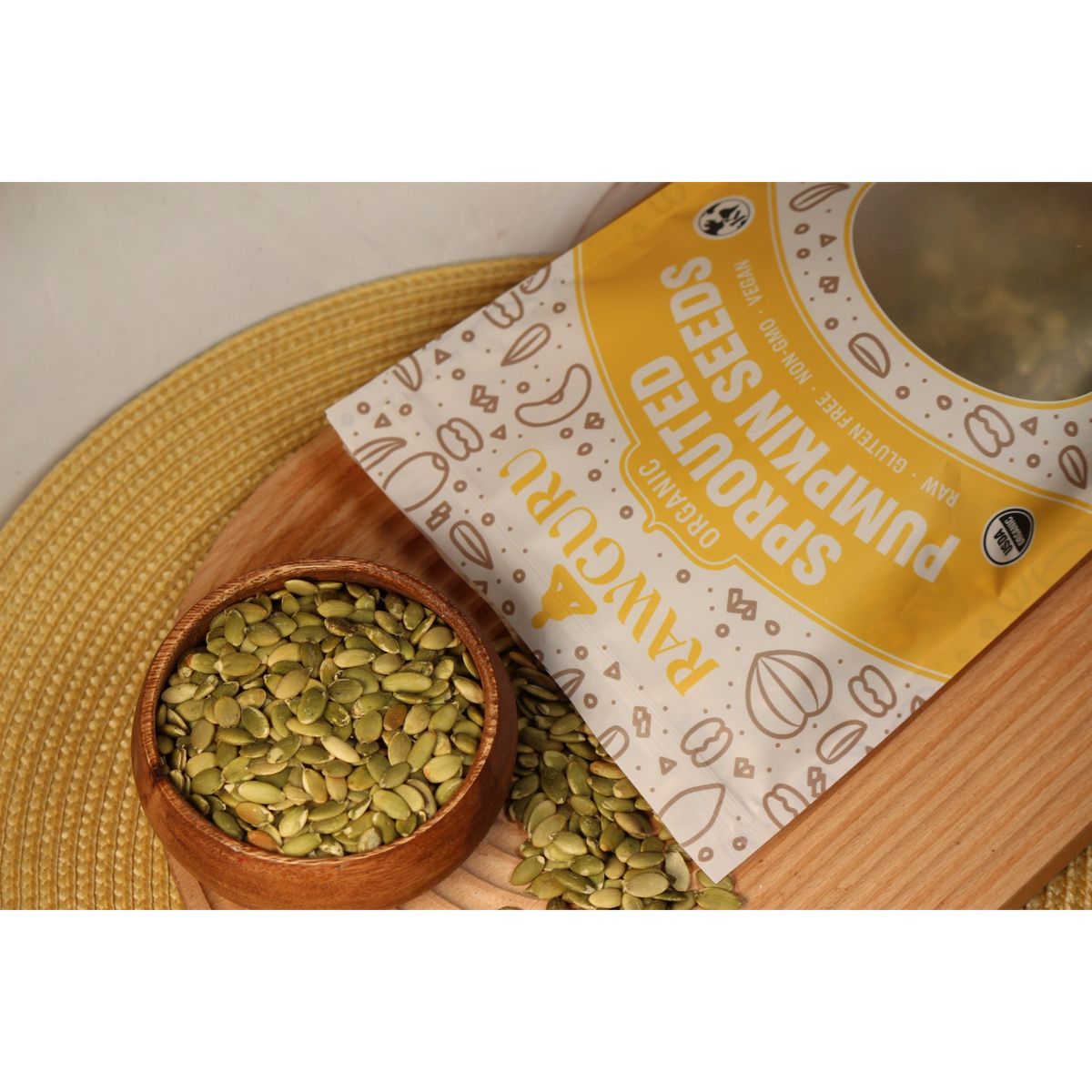 Semillas de Calabaza Germinadas Orgánicas RawGuru. Enteras, ricas en nutrientes y listas para disfrutar. ¡Agrega un toque saludable a tus snacks!