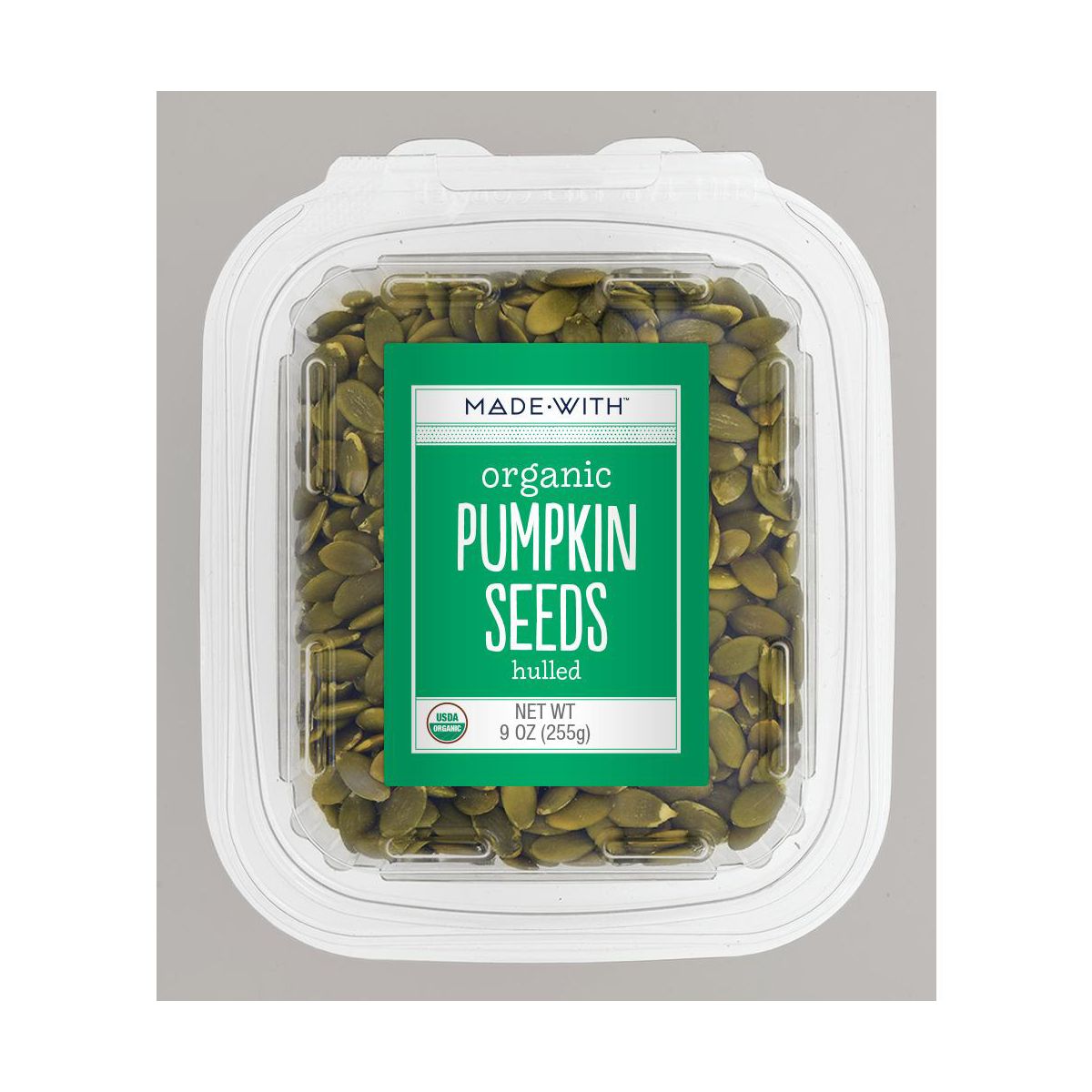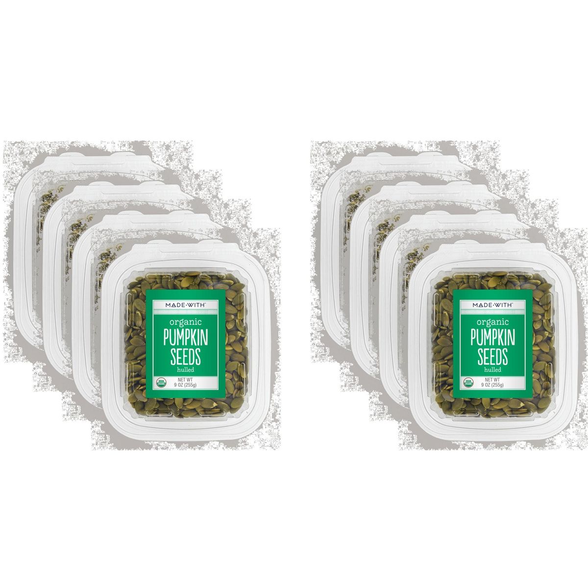 Semillas de Calabaza Orgánicas sin Sal MADE WITH. Paquete de 8 recipientes de 9 oz cada uno. Snack natural y nutritivo. ¡Compra ahora!