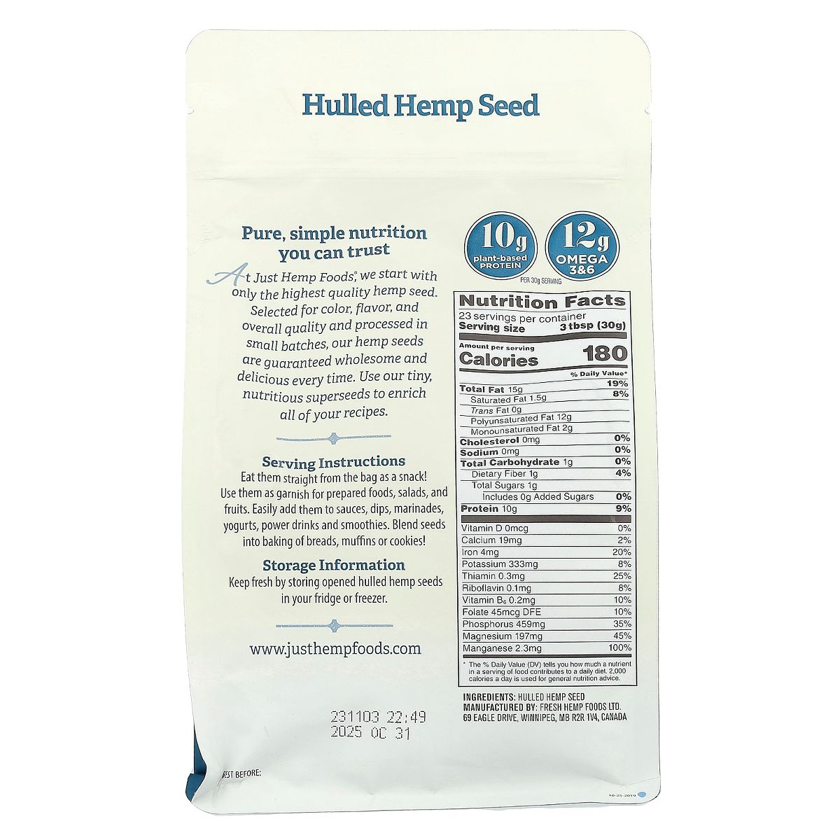 Semillas de cáñamo peladas Just Hemp Foods. Fuente natural de proteínas y omegas, ideal para tu dieta. Sin alérgenos mayores. ¡Pruébalas!