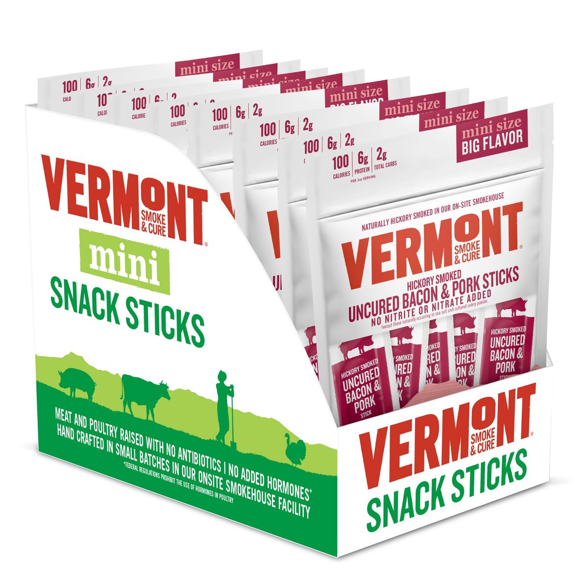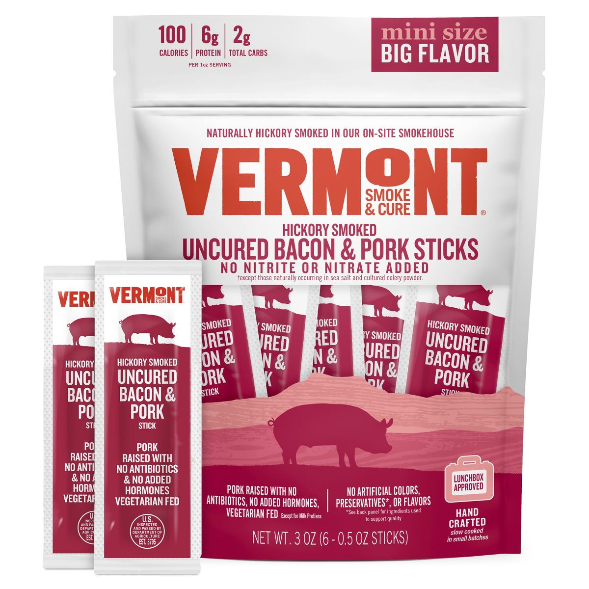 Snack Sticks de Vermont Smoke & Cure. Tocino de cerdo ahumado con leña de nogal, sin curar y sin gluten. Proteína saludable y lista para llevar.