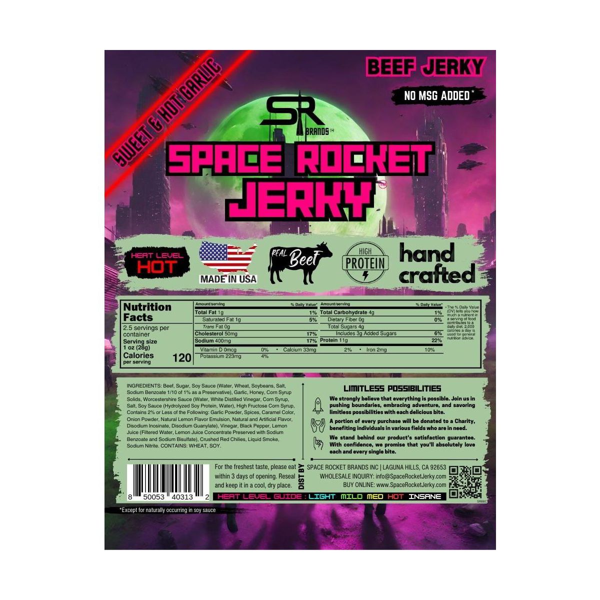 Space Rocket Beef Jerky: carne de res con sabor a ajo dulce y picante. 11g de proteína por porción. ¡Pruébalo en paquete de 3!