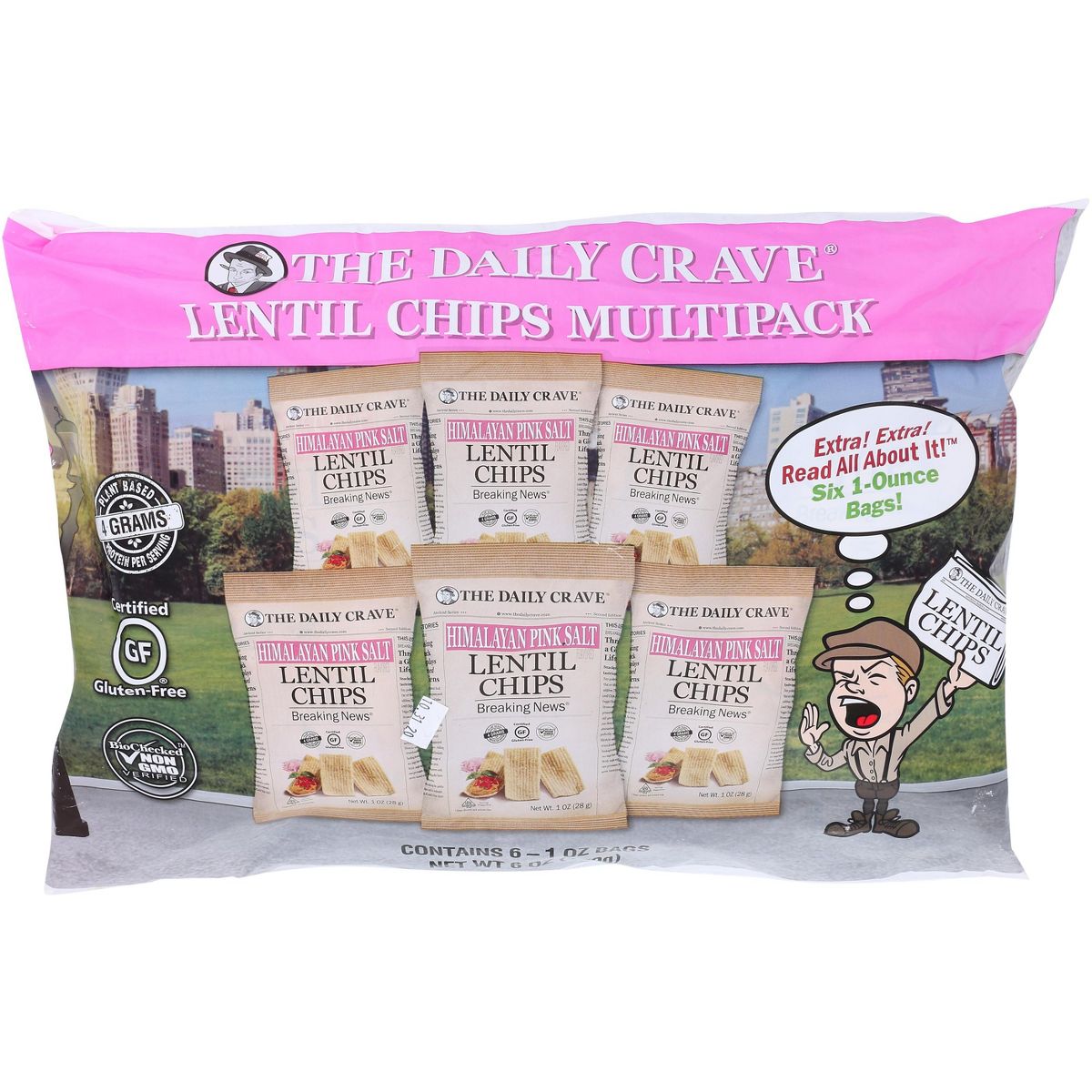 Disfruta los crujientes chips de lentejas The Daily Crave con sal rosa del Himalaya. Snack saludable y delicioso en paquete de 4.