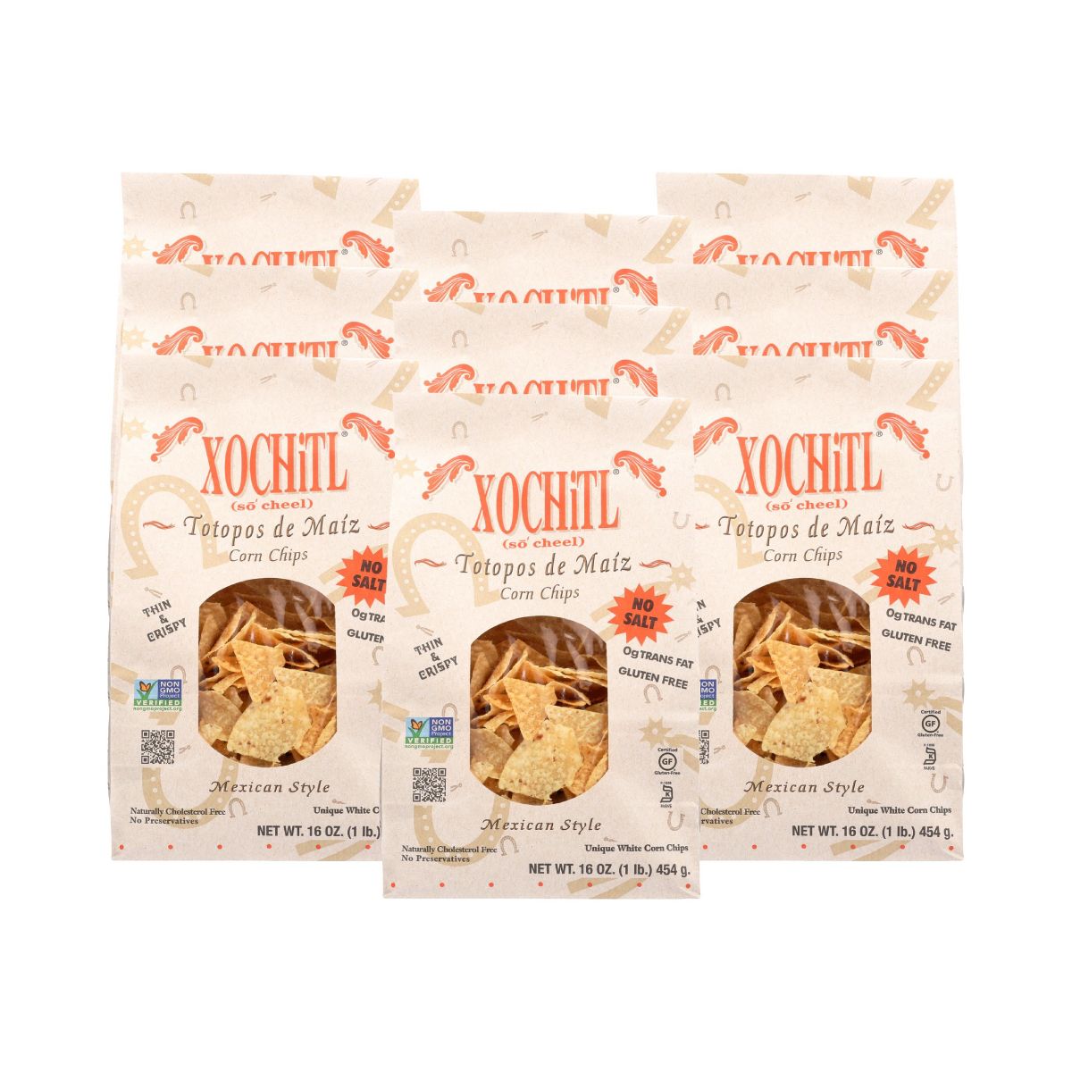 Totopos de maíz Xochitl sin sal, ideales para tus antojos. Sin gluten, certificados Kosher y Non-GMO. Disfruta el auténtico sabor.