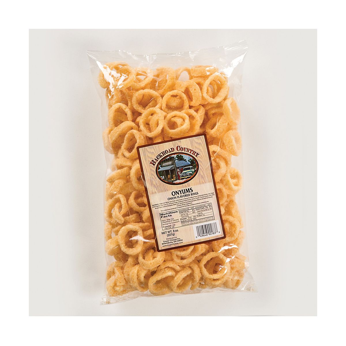 Disfruta los irresistibles Onyums de Troyer Cheese, aros crujientes con sabor a cebolla. ¡El snack perfecto para compartir en cualquier momento!