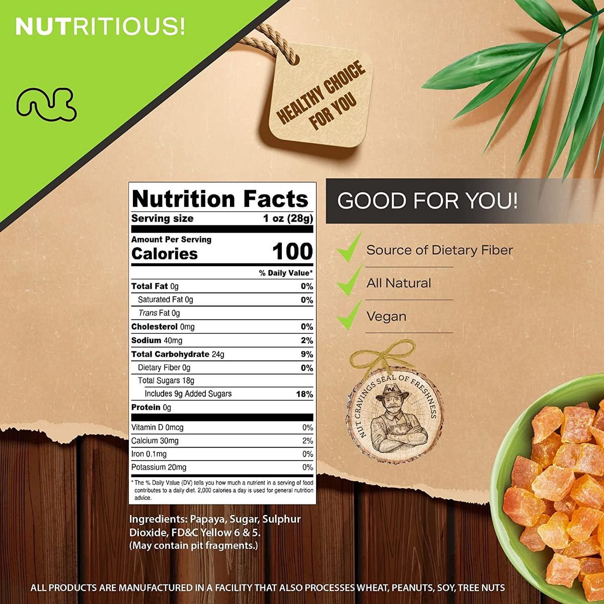 Disfruta los trozos de papaya seca al sol con azúcar añadida de Nut Cravings. Un snack dulce y natural, libre de los 9 alérgenos principales.