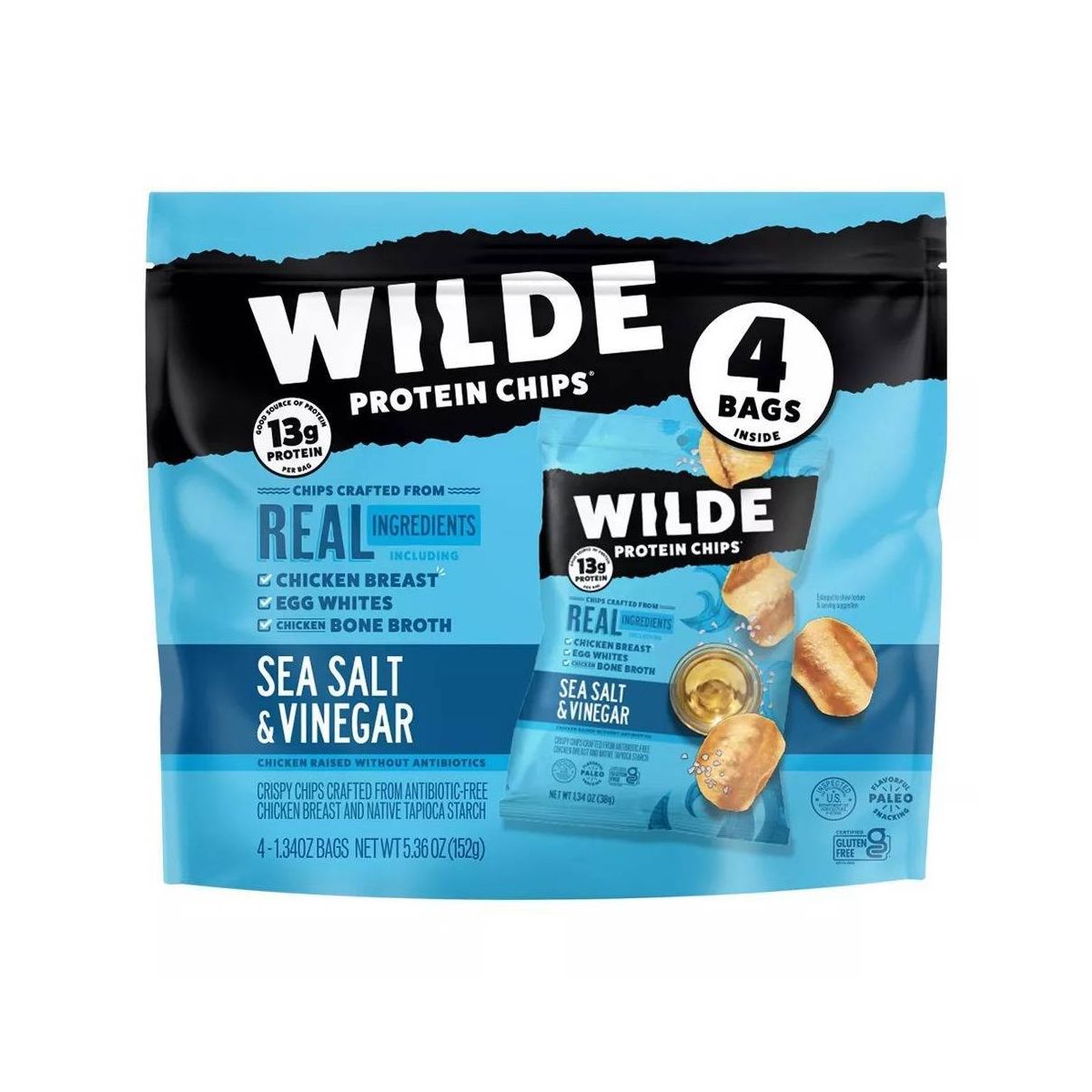 Papas WILDE con 13g de proteína, sabor Sal de Mar y Vinagre. Snack saludable y crujiente en paquete de 4. ¡Pruébalas!