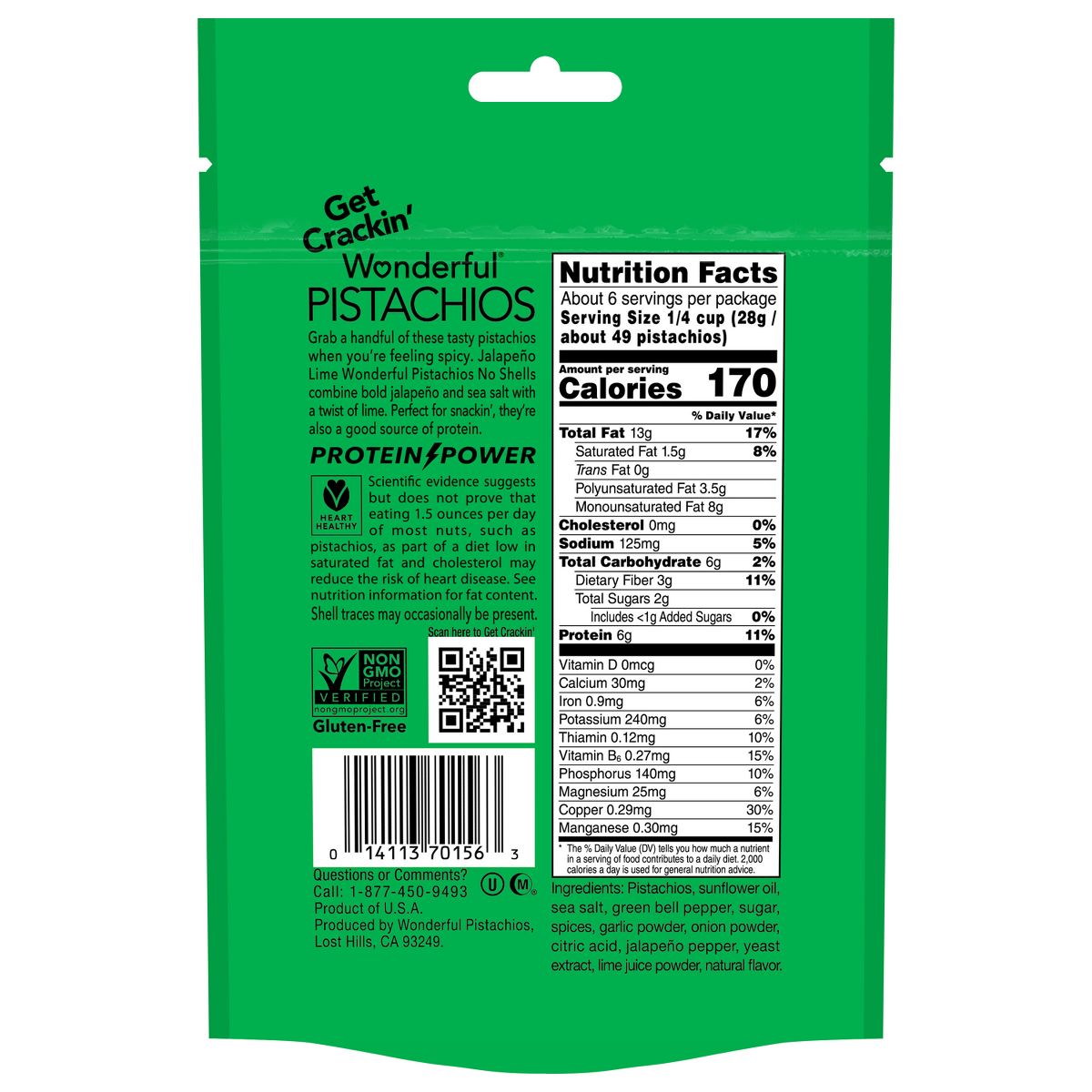 Disfruta el sabor audaz de Wonderful Pistachios sin cáscara, sabor jalapeño y lima. Snack perfecto y saludable para cualquier momento.