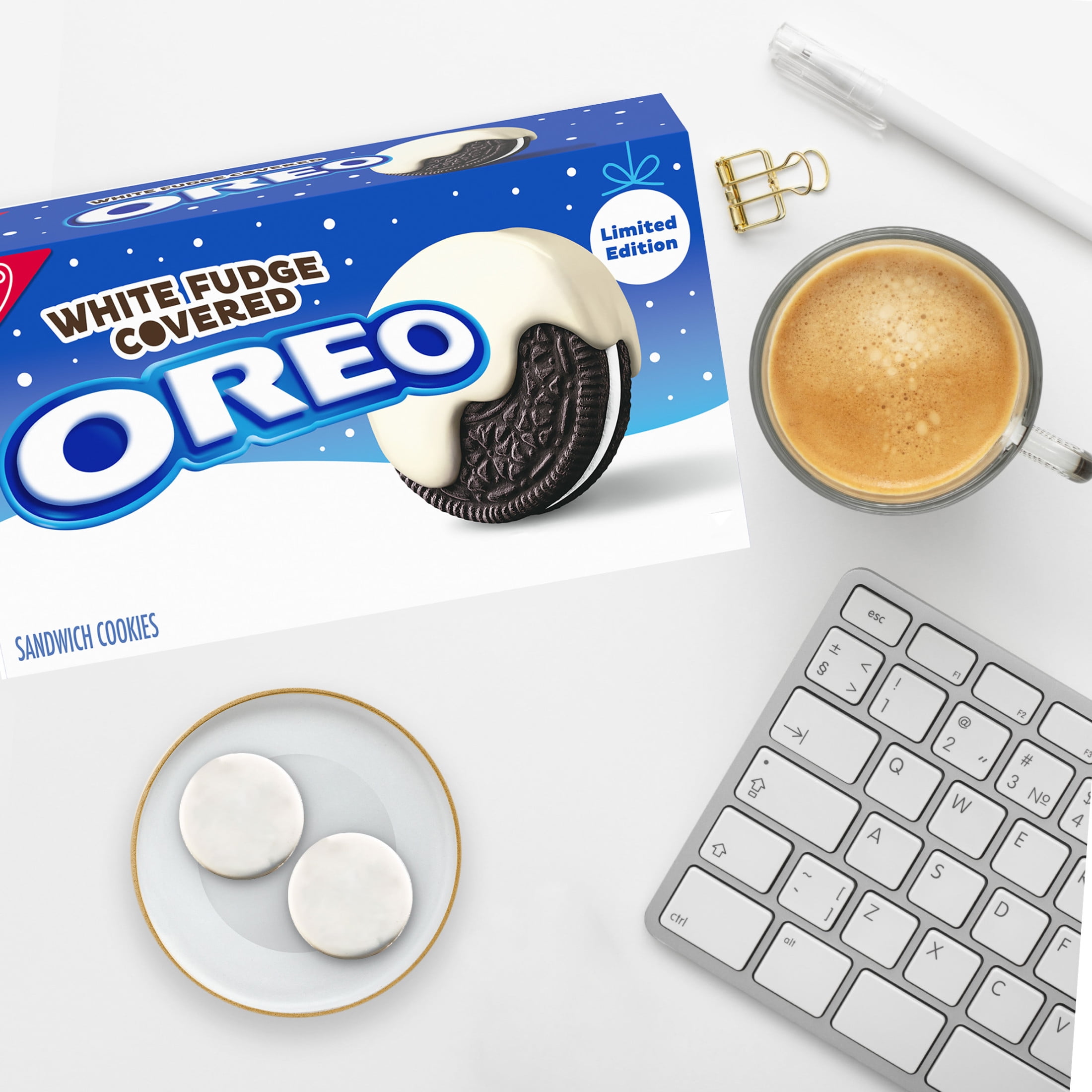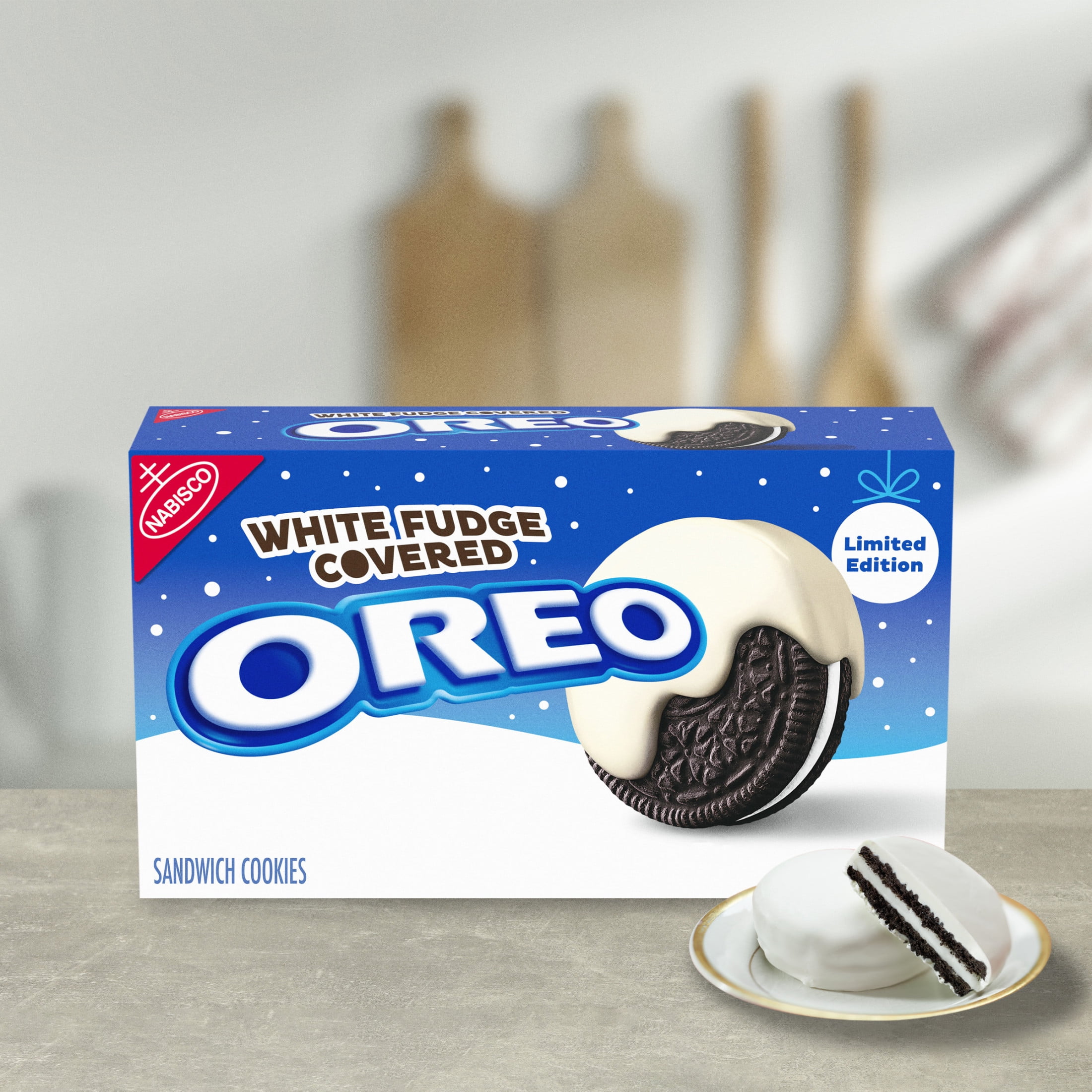 Galletas de sándwich de chocolate OREO cubiertas de fudge blanco en 1 paquete, galletas navideñas.